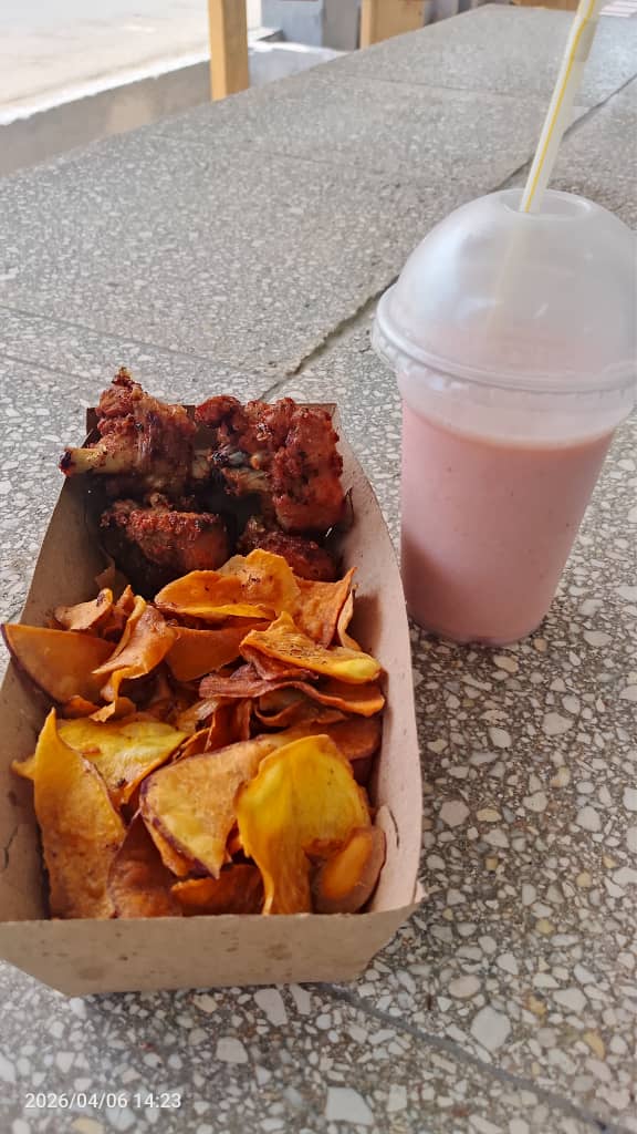 Contiene 100 g de Pollo chiflado 50 g de chicharritas y un vaso de batido